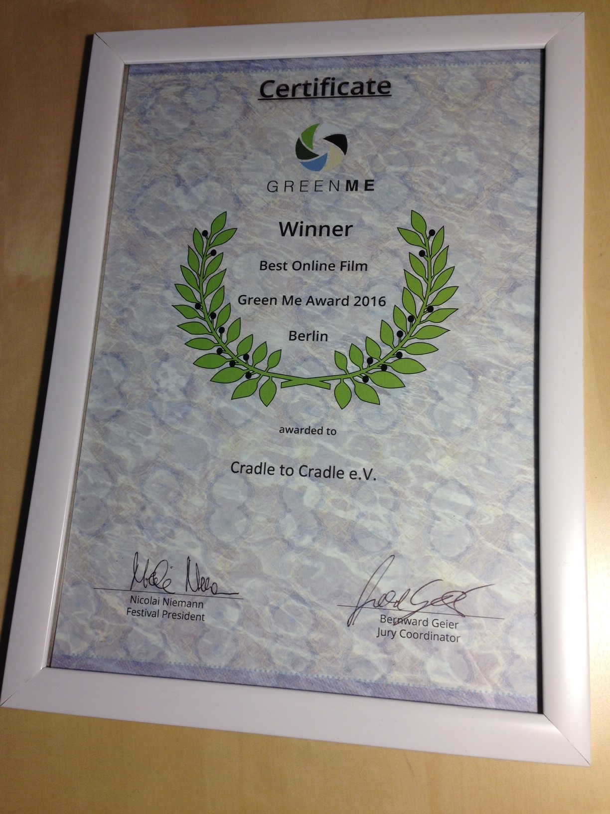 And the Oscar goes to…Mit dem Erklärvideo zum Thema Cradle to Cradle sind wir der diesjährige Preisträger auf dem 9. Green Me Filmfestival in der Kategorie „Best Online Film“! Das hervorragende Video wurde ehrenamtlich von unserer Freiberger Regionalgruppe, unter der Leitung von Anne Müller und Valentin Garbe, entwickelt und umgesetzt.