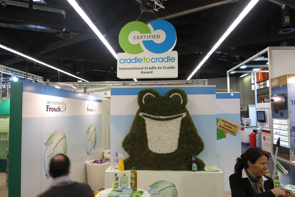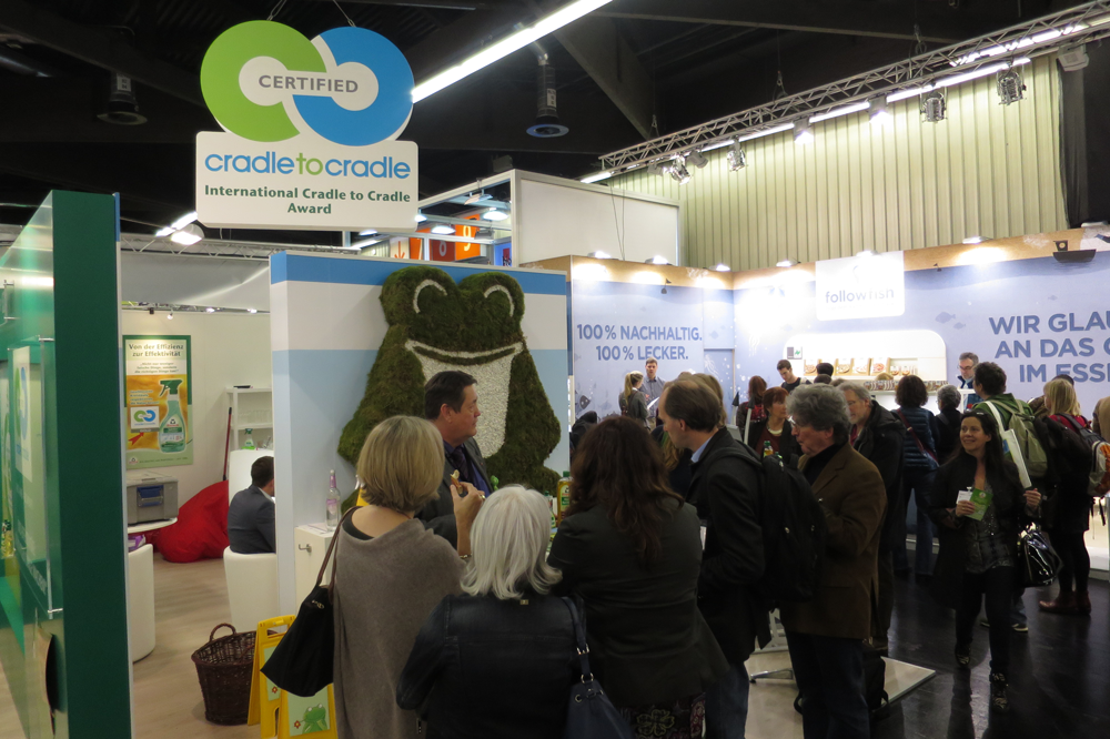 Wir trafen auf der Messe auch unser neues Beiratsmitglied Ulrich Walter am beeindruckenden Stand von Lebensbaum. Daneben führte unser Rundgang uns unter anderem zu Gesprächen mit Volker Krause (Bohlsener Mühle), Stefan Voelkel (Voelkel Getränke) und Günter Scheinkönig, Geschäftsführer der Erdal-Rex GmbH am Stand von Werner & Mertz beziehungsweise der Marke Frosch. Werner & Mertz zeichnen sich durch eine langjährige Beschäftigung mit dem Umweltgedanken aus und arbeiten auch daran, die Prinzipien des Cradle-to-Cradle-Designkonzepts in ihrem Unternehmen umzusetzen. Sichtbares Zeichen dieses Bekenntnisses zum Handeln war auf der Messe das riesige „C2C“-Logo, das über dem Stand hing.