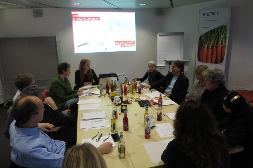 Da haben wir gleich zwei Fliegen mit einer Klappe geschlagen: Der Beirat des Cradle to Cradle e.V. traf sich zu einer konstruktiven Arbeitssitzung, und gleichzeitig konnten wir uns auf der Messe „Biofach“ in Nürnberg von vielen großartigen Initiativen und Unternehmen aus dem Bereich der Biolebensmittel ein Bild machen! Die Biofach gilt als die Leitmesse für Biolebensmittel und existiert seit mehr als 25 Jahren.