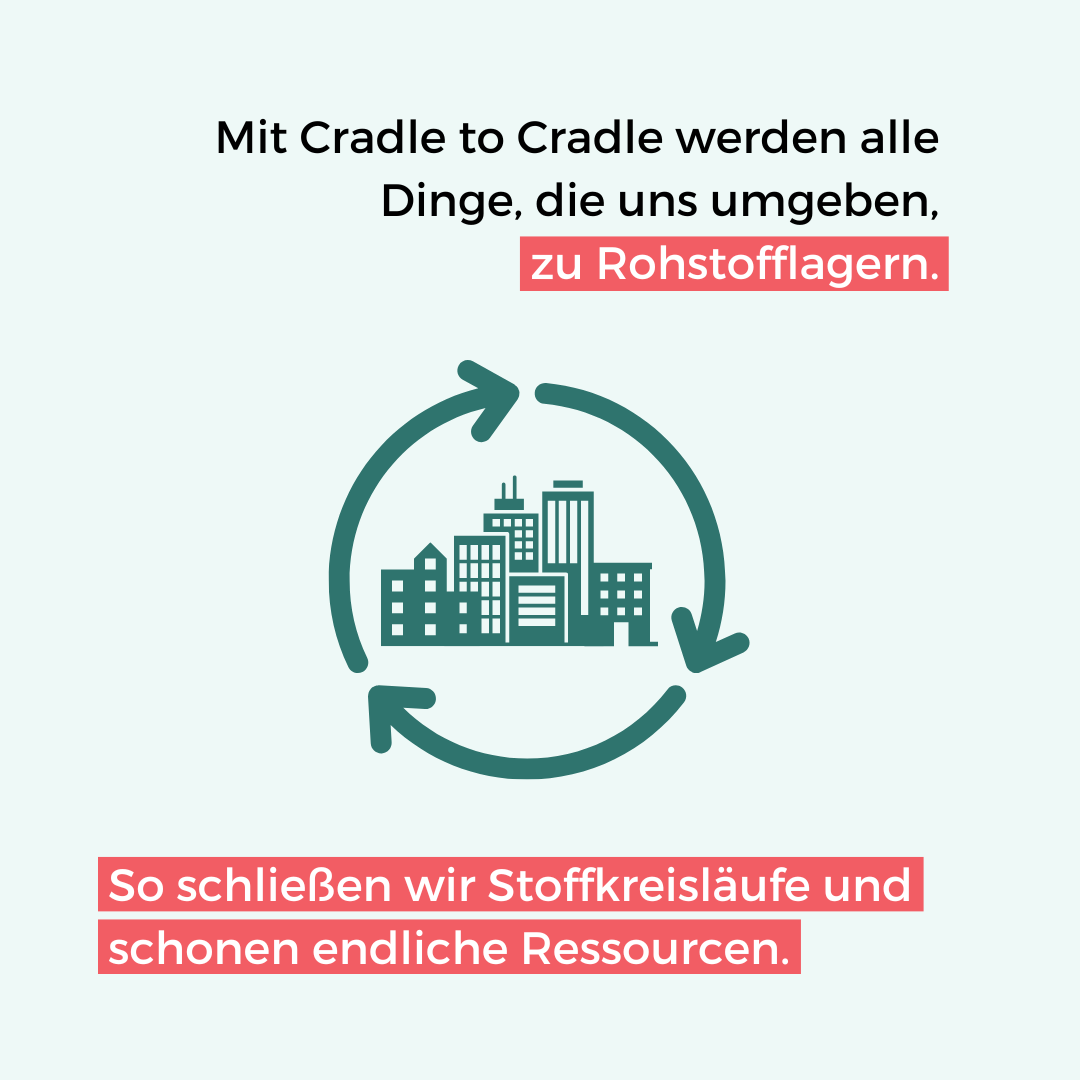 Mit Cradle to Cradle designen wir Gebäude und Produkte so, dass eine Kreislaufführung von Anfang an eingeplant und Urban Mining selbstverständlich wird! So werden alle Dinge, die uns umgeben, zu Rohstofflagern und helfen uns, endliche Ressourcen zu schonen.