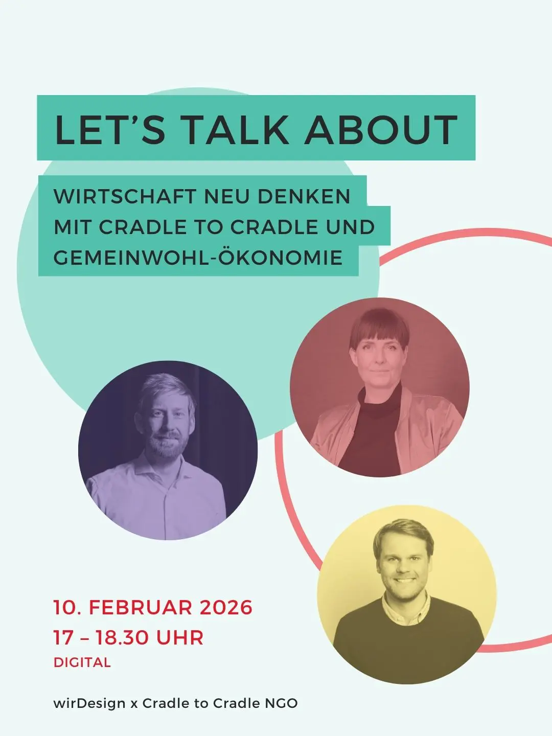 Wie kann Wirtschaft nicht nur weniger schaden, sondern aktiv Gutes bewirken? Darum geht es bei unserem Online-Event »Brands & Bytes« am 10. Februar 2026. Tim Janßen, geschäftsführender Vorstand und Mitbegründer von Cradle to Cradle, stellt den ganzheitlichen Ansatz der gemeinnützigen NGO für Umwelt-, Klima- und Ressourcenschutz vor. Carl-Luis Rieger gibt im Best-Case-Vortrag Einblicke in die praktische Umsetzung von Cradle to Cradle im Unternehmen WEPA. wirDesign-Vorständin Silke Parnack berichtet aus der Praxis von wirDesign und zeigt, wie Gemeinwohl-Ökonomie Haltung, Kultur und Strategie miteinander verbindet. Im Fokus stehen echte Erfahrungen und konkrete Learnings.