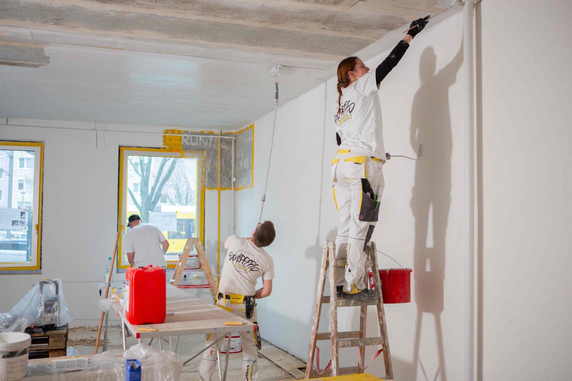 Beim Ausbau spielte das Handwerk eine entscheidende Rolle. Materialien, die für Kreisläufe designt sind, sind nur dann im Sinne von C2C wiederverwendbar, wenn sie so eingebaut werden, dass sie sich später rückstandslos wieder aus dem Gebäude entfernen oder umnutzen lassen. Bei der Sanierung arbeitete Cradle to Cradle NGO deshalb in einer Bildungskooperation mit dem Malerfachbetrieb Schippers & Söhne zusammen. Rund zehn Auszubildende begleiteten den gesamten Umbau – vom Rückbau bis zum Finish.