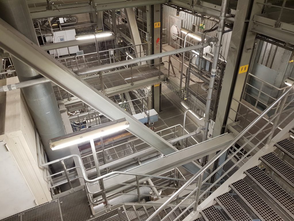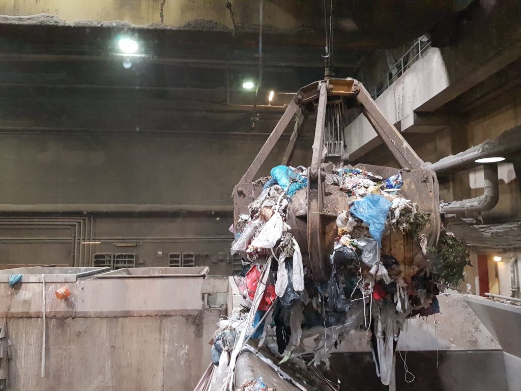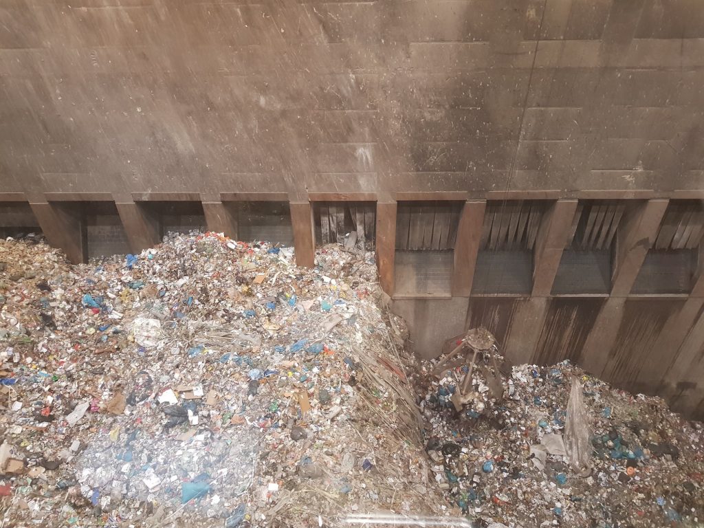 Schwindelfreiheit war ein hohes Gut, denn als Nächstes ging es im Kesselhaus auf Lichtgitterböden auf eine Höhe von 42m ü.N.N., von wo aus die beiden Verbrennungslinien für den Restmüll gut zu überblicken sind. Aus der Kanzel des Kranfahrers dann, gut 30 m über dem Grund des Müllbunkers, blickten wir auf eine riesige Menge Abfall: Windeln, Hamburger, Plastiktüten, Weihnachtsbäume, Kleidungsstücke, Elektrogeräte, Seile – nicht alles was vom Kranfahrer in die großen Trichter in Richtung Feuer befördert wird, müsste momentan eigentlich noch im Restmüll entsorgt werden. Stattdessen könnte es in Kreislaufen zirkulieren. Bei einigen Gegenständen fragten wir uns auch, wie diese überhaupt hier her, beziehungsweise in die schwarze Restmülltonne gelangt sind: So war auch mal ein ganzer Hubwagen dabei, erzählte die Leiterin der Besichtigung.