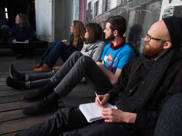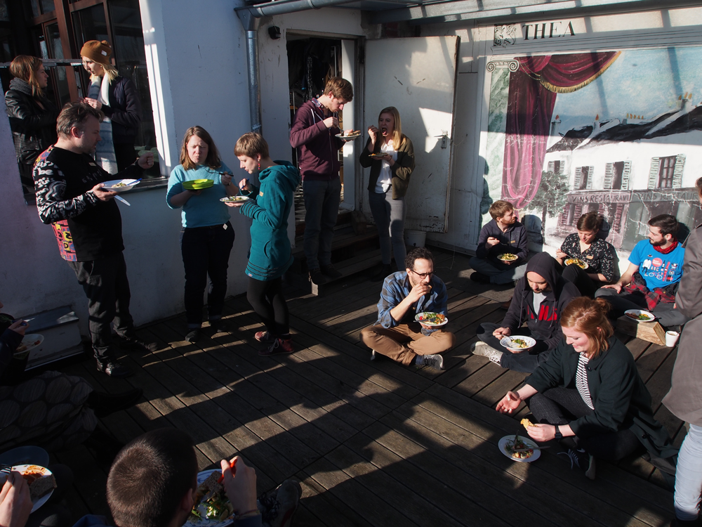 Für einen Samstag recht früh am Morgen (los geht’s um 9:00) trudeln langsam alle Teilnehmer*innen und Trainer*innen am Treffpunkt ein. Es handelt sich um ein riesiges Altbaudachgeschoss mit Terrasse, das zu einem wahnsinnig gemütlichen Allzweckraum ausgebaut wurde. Das Mitbringbuffet wächst und wächst und sieht immer besser aus. Dann geht’s endlich los. Die Trainer*innen Sanne, Jessica und Klaas stellen sich vor, anschließend werden Zweiergruppen gebildet. Wir haben fünf Minuten Zeit uns gegenseitig mit Fragen zu löchern, bevor wir den jeweils anderen der ganzen Gruppe vorstellen. In diesen fünf Minuten passiert, was sich den ganzen Tag über immer wieder wiederholen wird: Bevor man sich versieht, ist man in ein superspannendes Gespräch vertieft – und schwuppdiwupp ist die Zeit um und es geht weiter. Es treffen Menschen unterschiedlichster beruflicher Fachrichtungen, privater Hintergründe und Altersgruppen zusammen. Was uns eint? Wir haben keine Lust mehr auf immer weiter wachsende Müllberge und wir sind motiviert etwas zu verändern. Nur wie?